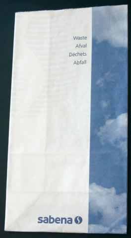 Subtelny worek z chmurkami po prawej stronie i delikatnym rysunkiem logo, które jest widoczne dopiero pod kątem. Sabena to skrót od Société Anonyme Belge d'Exploitation de la Navigation Aérienne.